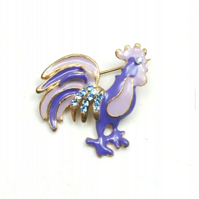 Broszka w postaci fioletowego kogucika z ozdobnymi cyrkoniami to idealny sposób dopełnienia kobiecego ubioru.